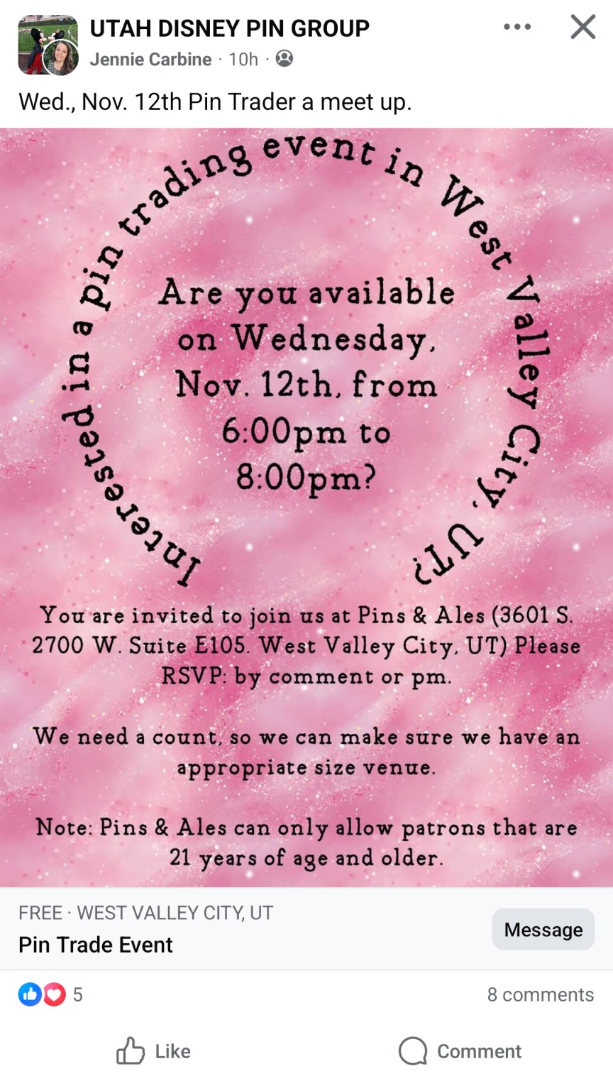 See "Utah Disney Pin Group" on Facebook to RSVP